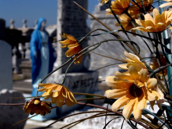 The streetlights flick on and she thinks she can hear them crackling and burning. The Quarter swells with people in a hurricane tide, more coming from the north side of the Quarter, where the St. Louis cemetery sits unmovable, save for this one night.