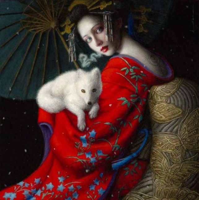 Hinges creak, and she swirls in the door, puts her finger to blue lips. Cold takes the old woodcutter, eyes open, breath frozen in his beard. But crystals melt in your lashes as you gaze on her glittering crown and trailing, frost-flowered sleeves. When you leave, you stagger in your straw cape, and you don’t straighten up until spring, when beauty strikes your heart like a splinter of ice. You shiver, remembering a white face, but you say nothing, not even when you lie beside her, touching her translucent throat, the cool rim of her hipbone, black hair rippling like snowmelt down the pillow. What is winter? When she laughs, you hear ice chiming on a lake. A cold ax and warm sake, she says. Don’t ask again. Yuki-onna will kiss your chapped lips and leave you sleeping like a child swaddled in snow.