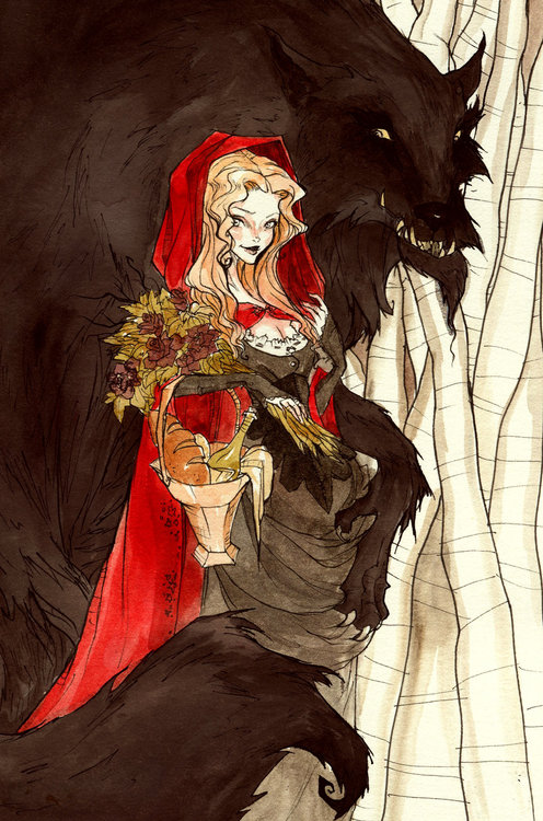 Wolf can’t handle buttons. So before he savages Granny’s throat he forces her to disrobe & dress him in her own clothes. Wolf gags at the stench of the smudged…
